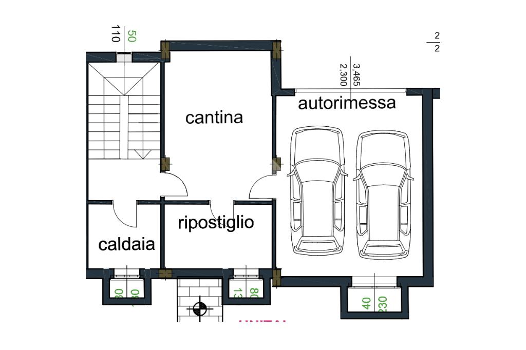 Al piano interrato, collegato internamente, si fanno spazio cantina, ripostiglio e box auto doppio in larghezza.