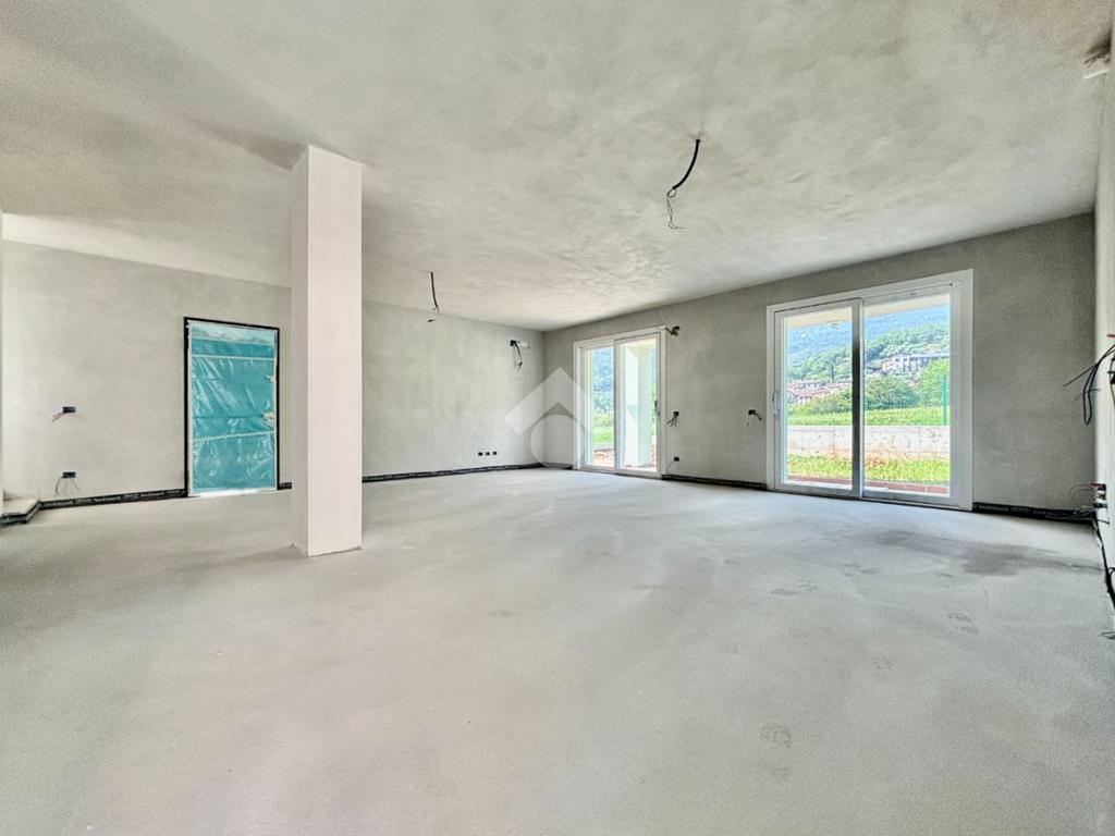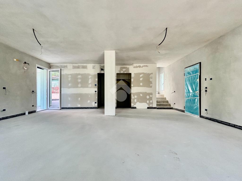 L'immobile, articolato su tre livelli, è ottimamente esposto e soleggiato e gode di ottima vista panoramica sul verde circostante. Al piano terra è presente la zona living openspace di circa 52 mq calpestabili comprendenti cucina a vista, sala da pranzo e salotto, con accesso al giardino da tutti i lati dell'abitazione, disimpegno, ripostiglio e bagno finestrato con doccia per un totale di oltre 65 mq su un unico livello. L'area esterna, di oltre 300 mq, comprende porticato di 25 mq, plateatico privato di 100 mq e verde esclusivo piantumabile di circa 200 mq. Il primo piano ospita tre grandi camere da letto di oltre 12 mq tutte con sfogo esterno, di cui una padronale con bagno e accesso diretto alla loggia di circa 18 mq dalla quale si può godere un'invidiabile vista aperta sul verde circostante. Un secondo bagno serve le restanti stanze da letto e un pratico e funzionale ripostiglio funge da disbrigo. Al piano interrato si fa spazio la taverna finestrata, la funzionale lavanderia ed il grande box auto di oltre 40 mq.