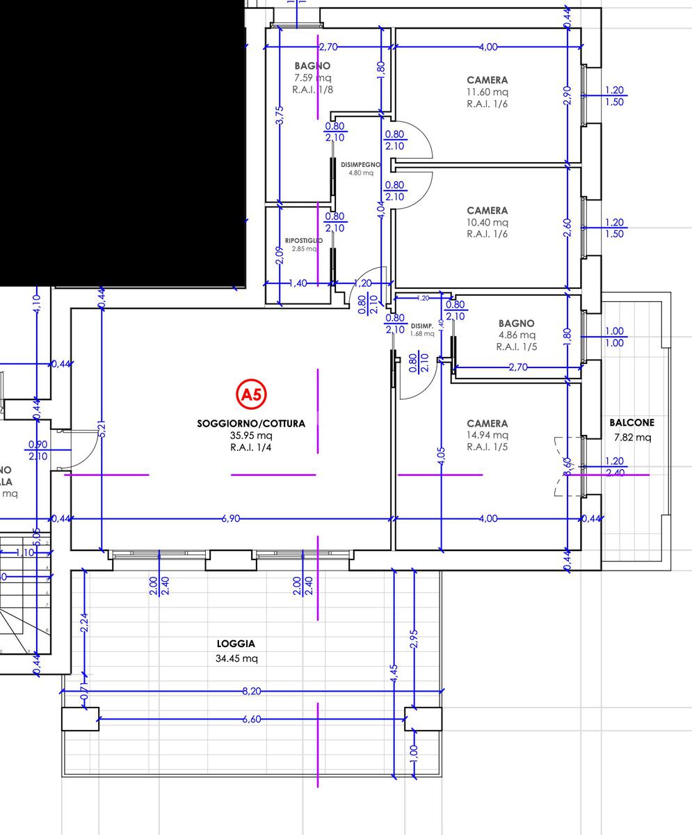 L'appartamento quadrilocale al piano attico con terrazzo di circa 40 mq e portico di oltre 19 mq che possono ospitare un ampio tavolo e divani da esterno oltre ad una piccola jacuzzi, si caratterizza di tripla esposizione che ne garantisce luce naturale e privacy valorizzando maggiormente gli spazi interni distribuiti interamente su piano unico: ampio living open-space di quasi 40 mq, tre camere matrimoniali grandi, doppi servizi finestrati e pratico ripostiglio. Al piano interrato, box auto di oltre 45 mq.
