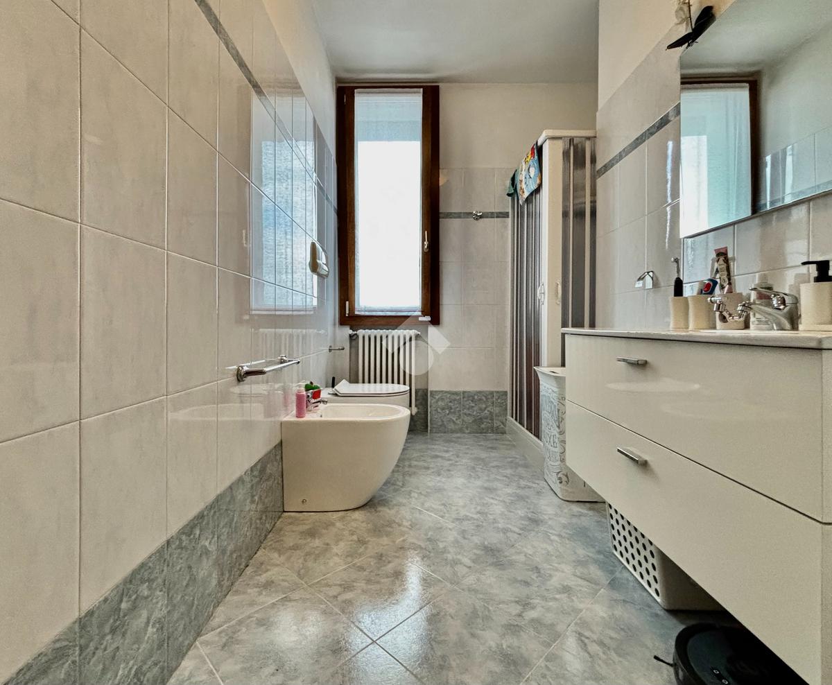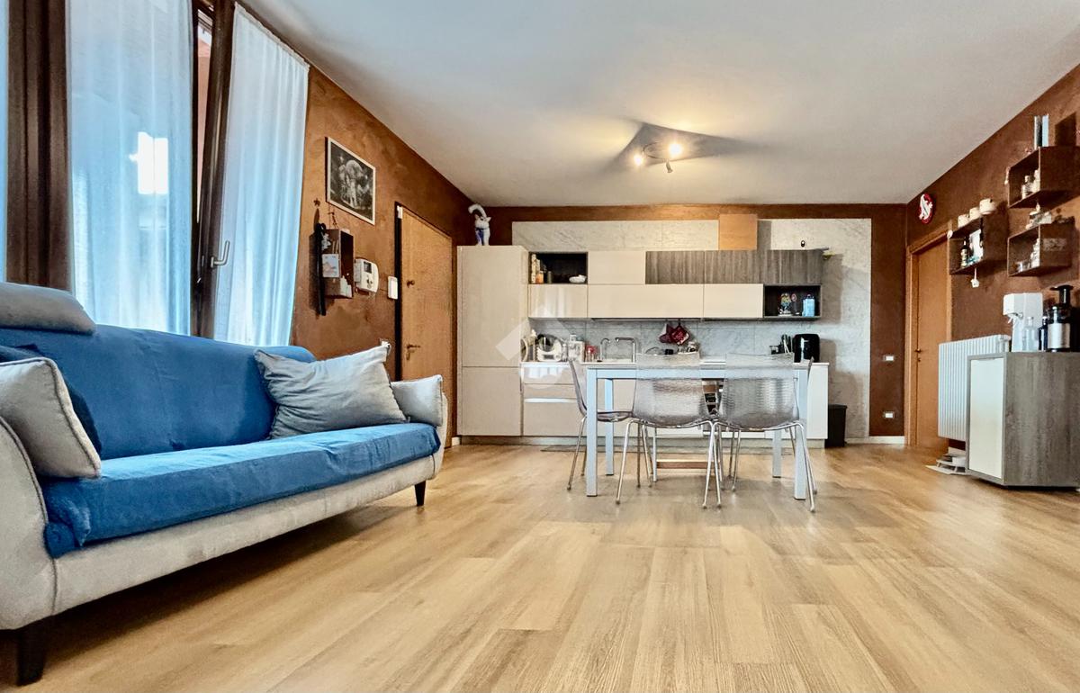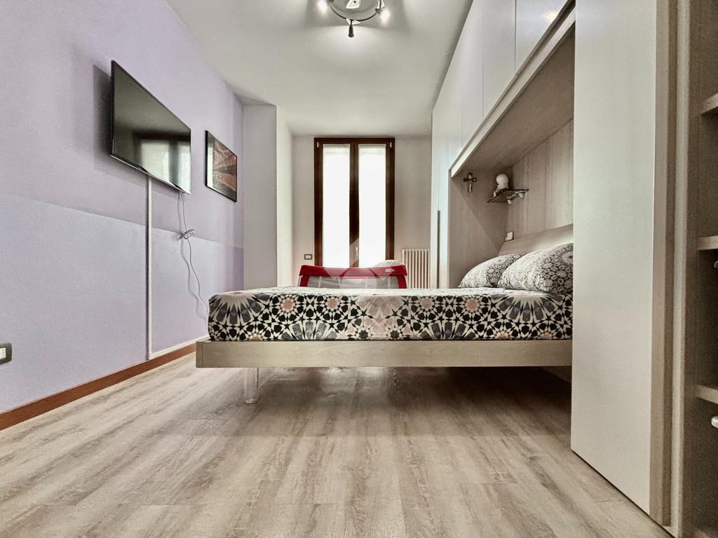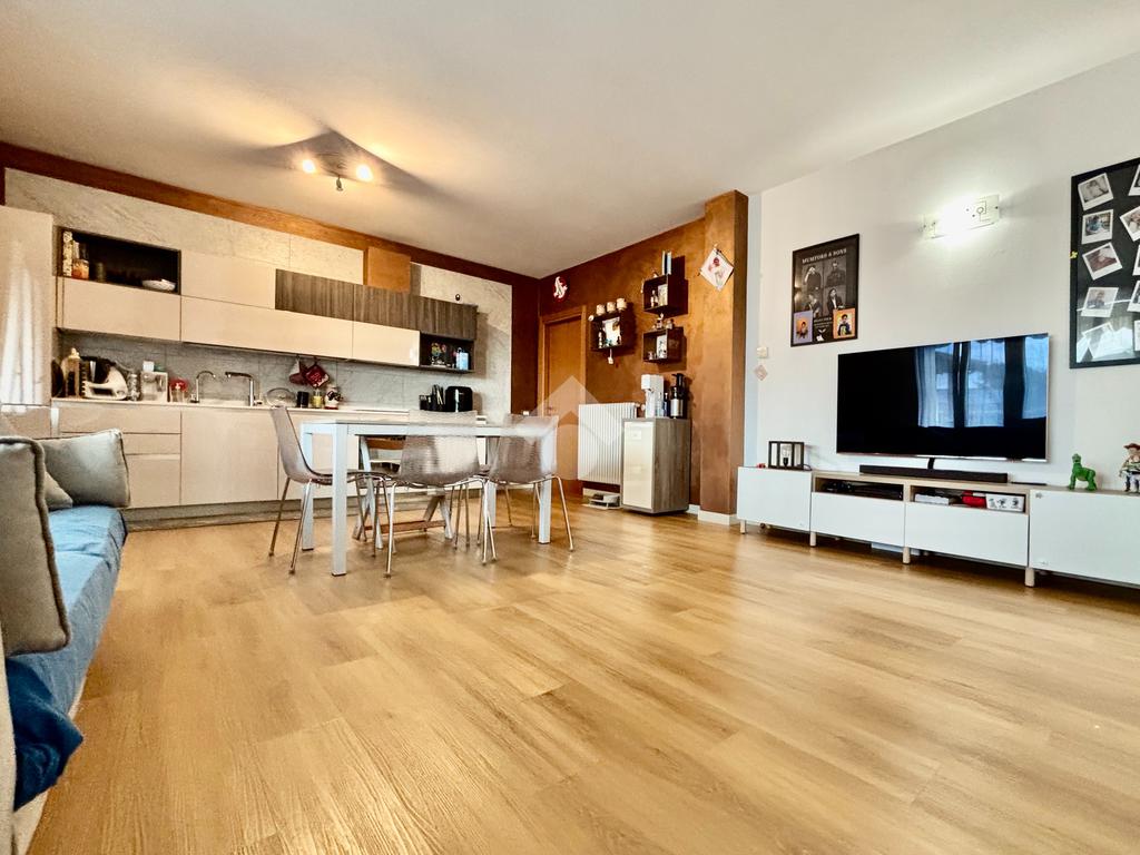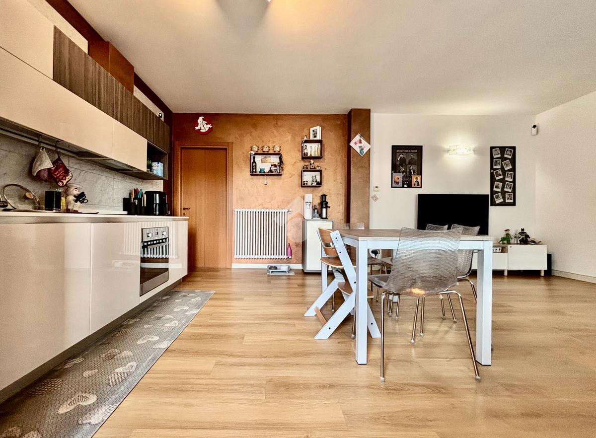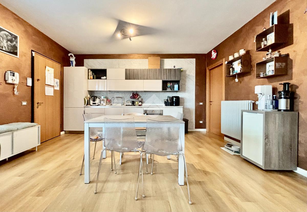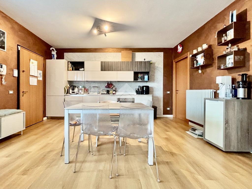La soluzione si apre su un luminoso soggiorno con cucina a vista, ambiente ben esposto alla luce grazie all’ampia finestra a triplo battente. Da qui si accede alla loggia, perfetta per godersi momenti di relax all’esterno. La zona notte ospita una spaziosa camera matrimoniale con balcone, una seconda cameretta e un bagno finestrato con doccia e lavanderia. Completano la proprietà un posto auto esclusivo situato all’interno della corte e un box doppio in lunghezza nel piano interrato.