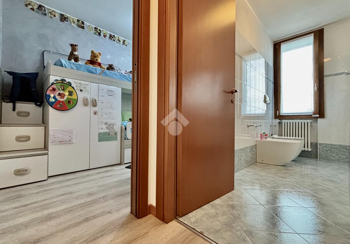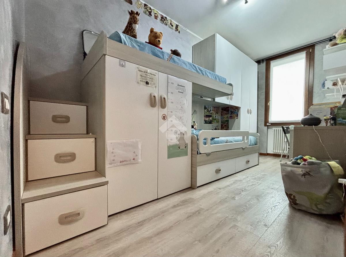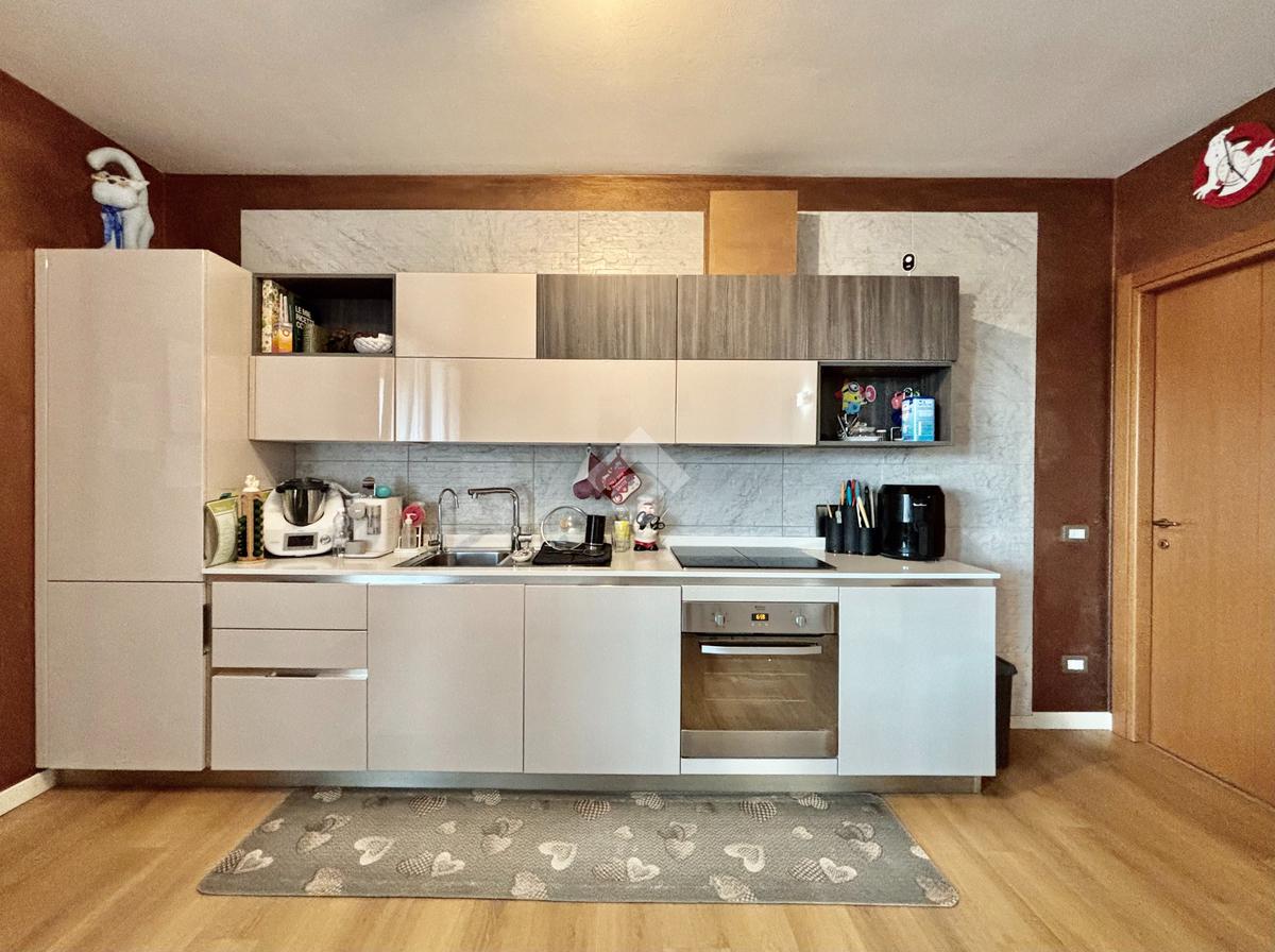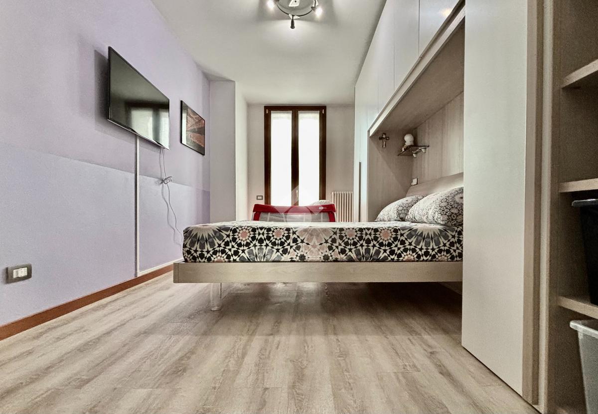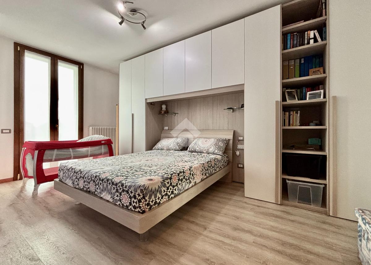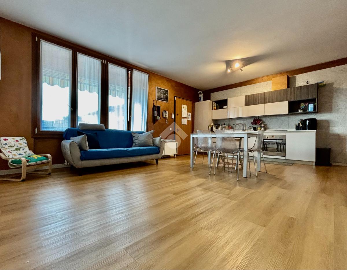La soluzione si apre su un luminoso soggiorno con cucina a vista, ambiente ben esposto alla luce grazie all’ampia finestra a triplo battente. Da qui si accede alla loggia, perfetta per godersi momenti di relax all’esterno. La zona notte ospita una spaziosa camera matrimoniale con balcone, una seconda cameretta e un bagno finestrato con doccia e lavanderia. Completano la proprietà un posto auto esclusivo situato all’interno della corte e un box doppio in lunghezza nel piano interrato.