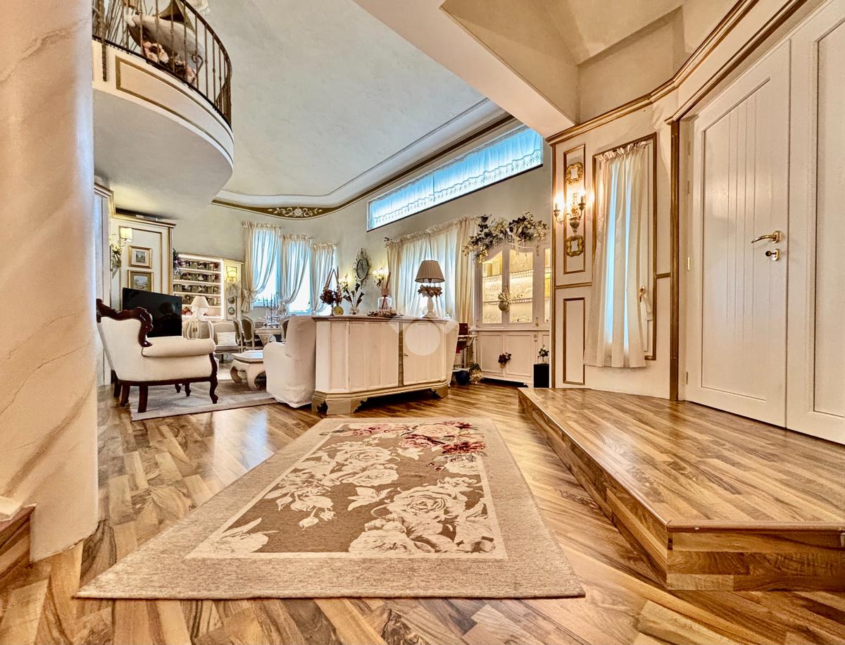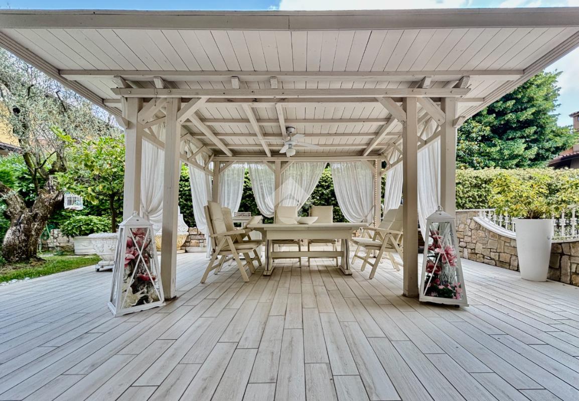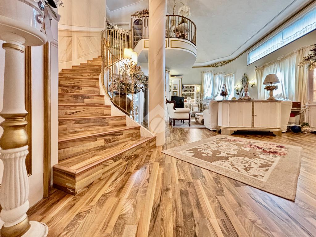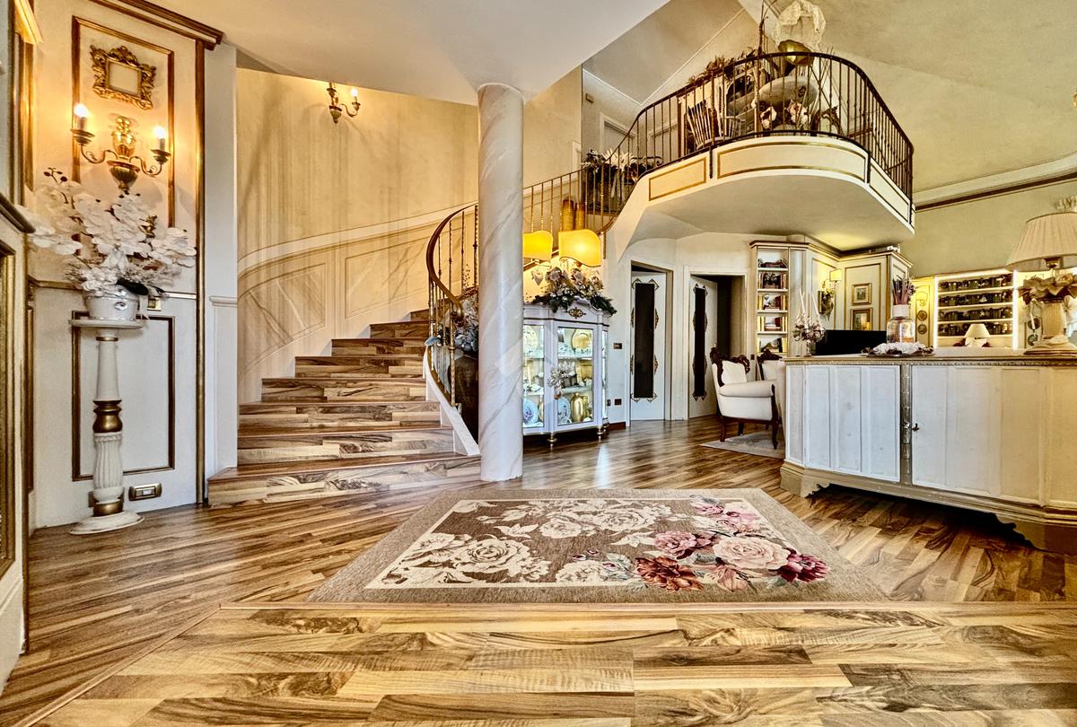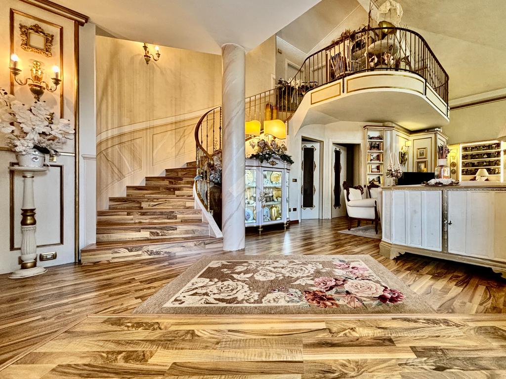 Prestigiosa proprietà con elevatissimo livello di finiture, design ricercato e materiali di pregio che impreziosiscono l’immobile rendendolo unico, come il pavimento in legno color noce nazionale, la pietra naturale a vista del Credaro, marmi e ceramiche di altissima qualità. Ristrutturazioni totali nel 2017 e nel 2023 che garantiscono la massima efficienza energetica e comfort abitativo, con cappotto esterno, serramenti in triplo vetro di ultima generazione e impianto fotovoltaico da 8kWh con batterie di accumulo. Il piano terra accoglie una luminosa ed elegante zona living a doppia altezza di circa 52 mq, comprendente sala da pranzo e zona conversazione con camino in marmo, valorizzata dalle ampie aperture che inondano gli ambienti di luce naturale. La cucina di circa 19 mq è separata, abitabile e completa di dispensa, con accesso al vivibile patio esterno e al pergolato. Il corridoio conduce alla prima zona notte, suddivisa in due camere da letto e importante bagno finestrato completo di lavabo e vasca da bagno in muratura. La scenografica scala a vista elicoidale conduce al piano superiore, ove si apre un suggestivo ballatoio che si affaccia sulla sala da pranzo. Su questo livello si sviluppa la camera padronale con cabina armadio, un bagno finestrato con doccia e uno studio. Entrambi gli ambienti affacciano su balconi privati. Il piano interrato, esteso su circa 140 mq, è stato progettato per offrire comfort e funzionalità. La taverna è dotata di una cucina a vista completamente attrezzata e un forno professionale a legna, ideale per preparare pizze e organizzare cene conviviali. Un elegante camino bifacciale collega questo ambiente ad un'accogliente area relax, arredata con comodi divani. Completano il tutto una stanza hobby, una palestra, una lavanderia e un bagno con doccia, offrendo così spazi dedicati a diverse attività. Collegata direttamente all’abitazione è presente l’autorimessa di oltre 80 mq, che può ospitare fino a cinque vetture.
