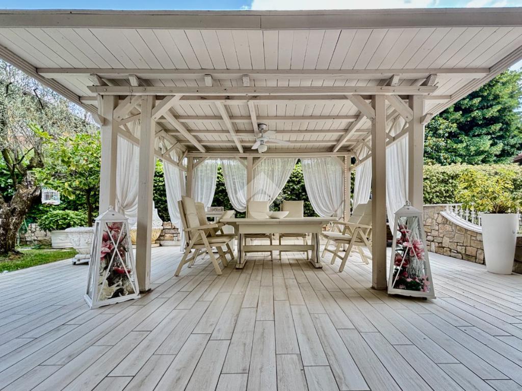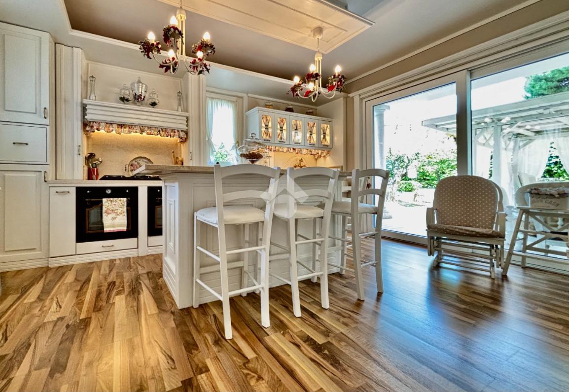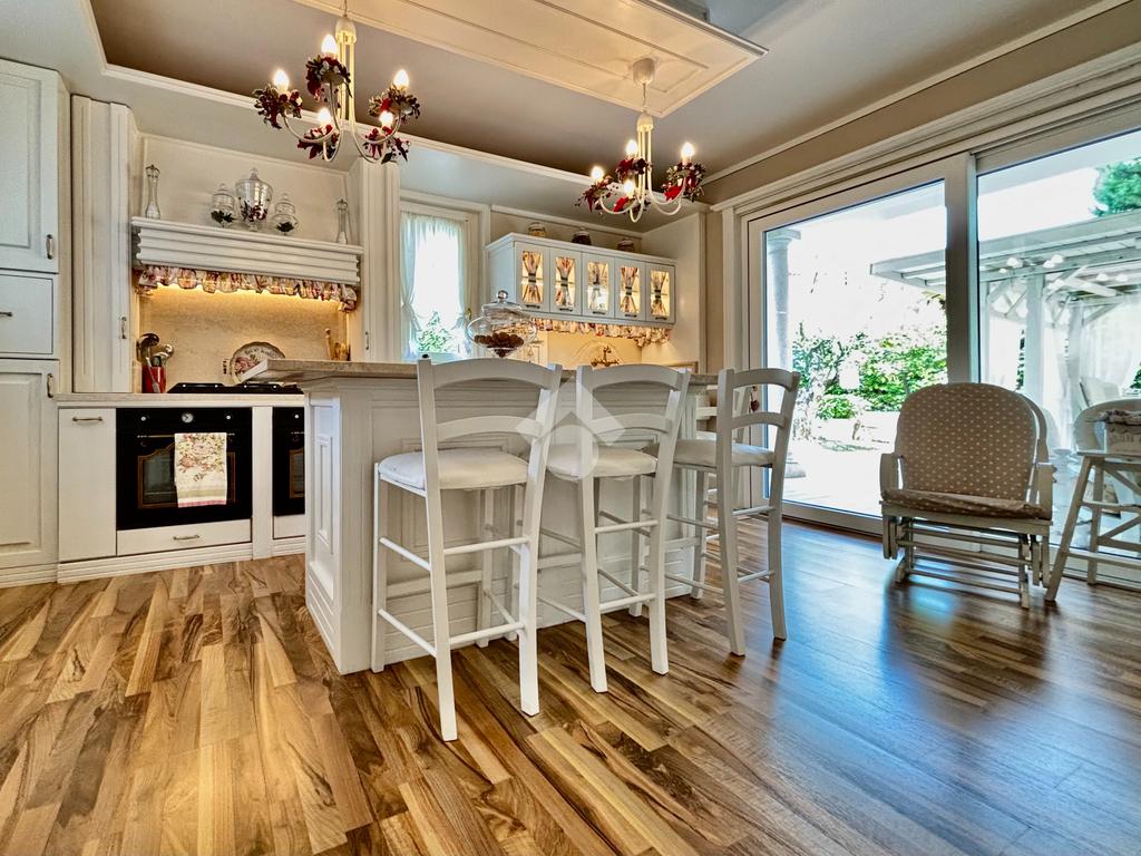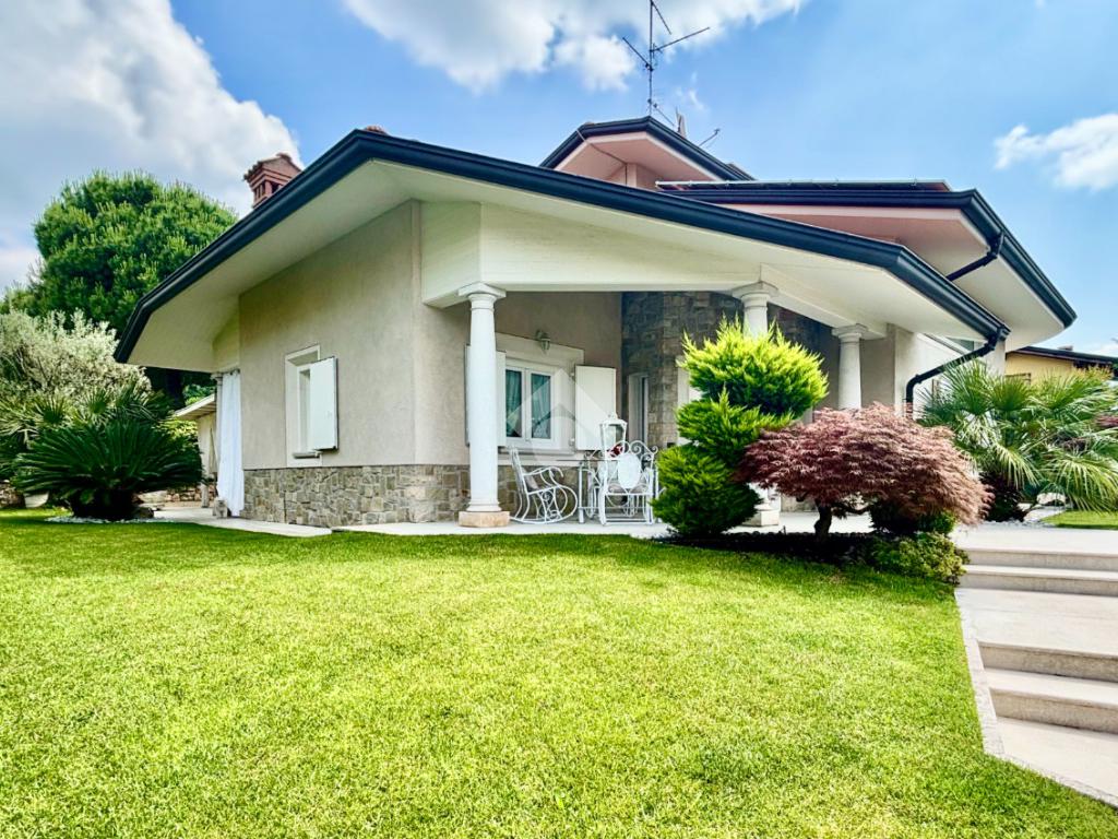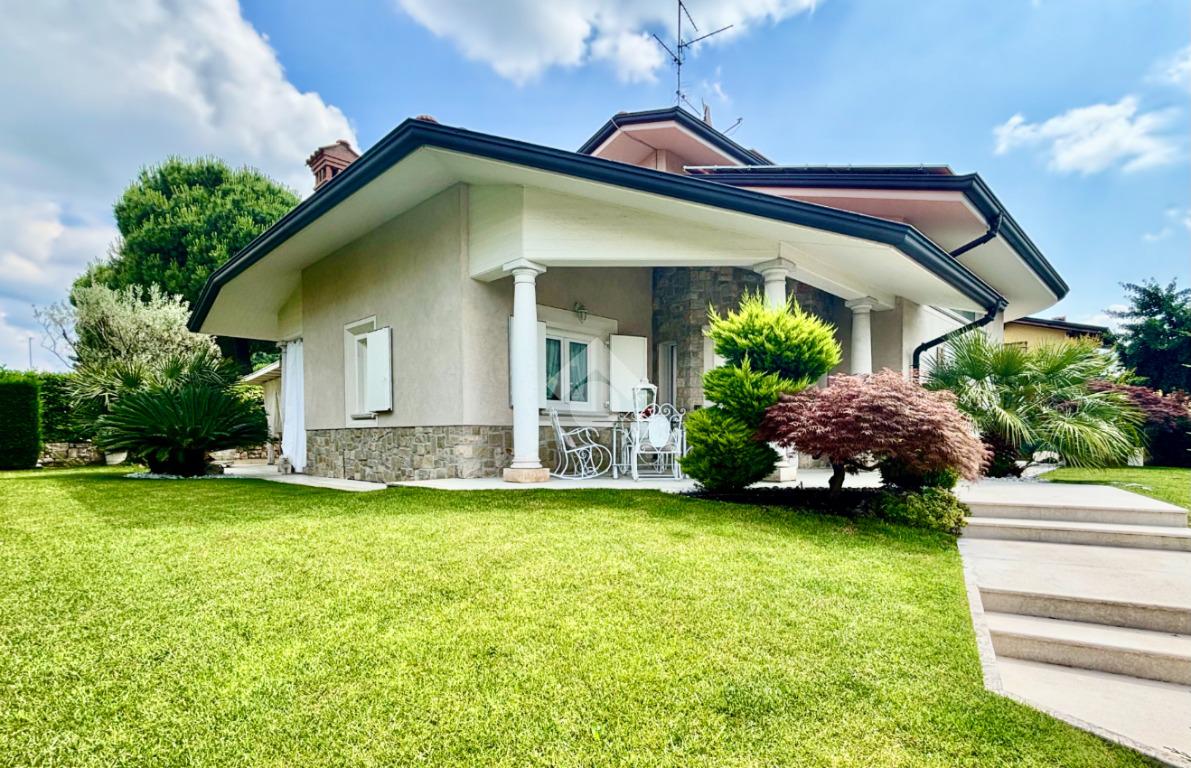 Prestigiosa proprietà con elevatissimo livello di finiture, design ricercato e materiali di pregio che impreziosiscono l’immobile rendendolo unico, come il pavimento in legno color noce nazionale, la pietra naturale a vista del Credaro, marmi e ceramiche di altissima qualità. Ristrutturazioni totali nel 2017 e nel 2023 che garantiscono la massima efficienza energetica e comfort abitativo, con cappotto esterno, serramenti in triplo vetro di ultima generazione e impianto fotovoltaico da 8kWh con batterie di accumulo. Il piano terra accoglie una luminosa ed elegante zona living a doppia altezza di circa 52 mq, comprendente sala da pranzo e zona conversazione con camino in marmo, valorizzata dalle ampie aperture che inondano gli ambienti di luce naturale. La cucina di circa 19 mq è separata, abitabile e completa di dispensa, con accesso al vivibile patio esterno e al pergolato. Il corridoio conduce alla prima zona notte, suddivisa in due camere da letto e importante bagno finestrato completo di lavabo e vasca da bagno in muratura. La scenografica scala a vista elicoidale conduce al piano superiore, ove si apre un suggestivo ballatoio che si affaccia sulla sala da pranzo. Su questo livello si sviluppa la camera padronale con cabina armadio, un bagno finestrato con doccia e uno studio. Entrambi gli ambienti affacciano su balconi privati. Il piano interrato, esteso su circa 140 mq, è stato progettato per offrire comfort e funzionalità. La taverna è dotata di una cucina a vista completamente attrezzata e un forno professionale a legna, ideale per preparare pizze e organizzare cene conviviali. Un elegante camino bifacciale collega questo ambiente ad un'accogliente area relax, arredata con comodi divani. Completano il tutto una stanza hobby, una palestra, una lavanderia e un bagno con doccia, offrendo così spazi dedicati a diverse attività. Collegata direttamente all’abitazione è presente l’autorimessa di oltre 80 mq, che può ospitare fino a cinque vetture.